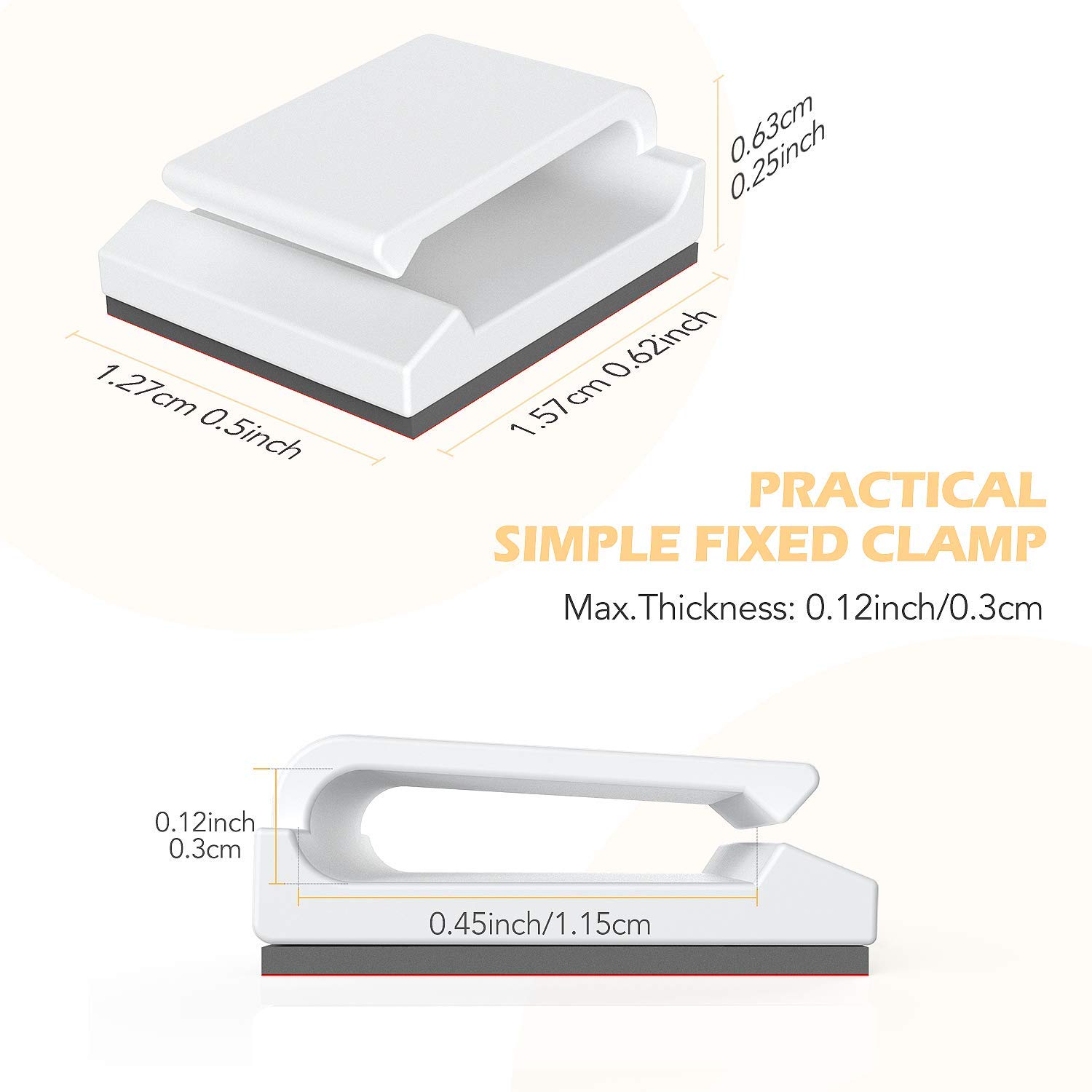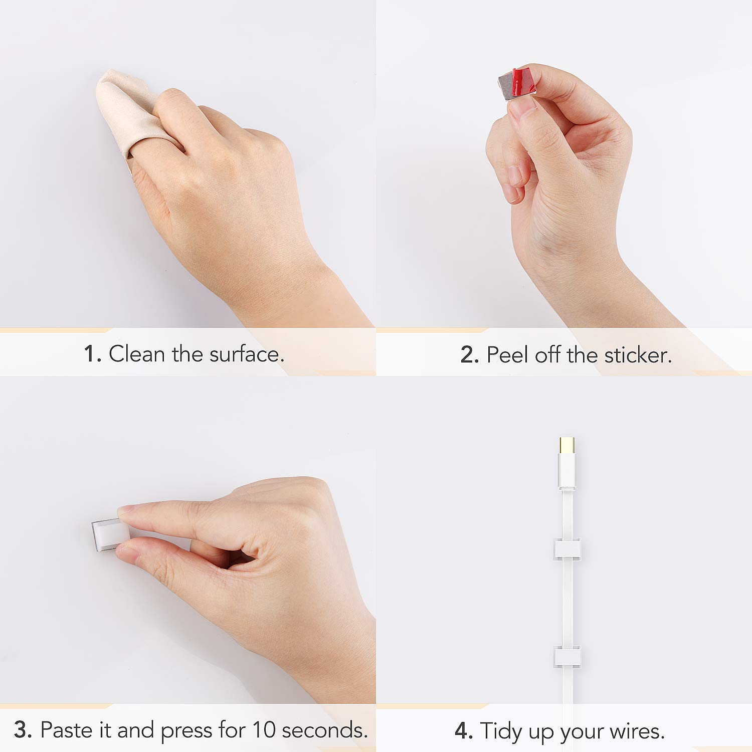 • 【NOTE】 A clean assembly surface is necessary. No dirt, dust, fat or wax. Please do not introduce the cable immediately after the cable clips have been glued to the surface. The double-sided adhesive pad reaches the strongest liability after 24 hours. You can heat the strip with a hair dryer before use