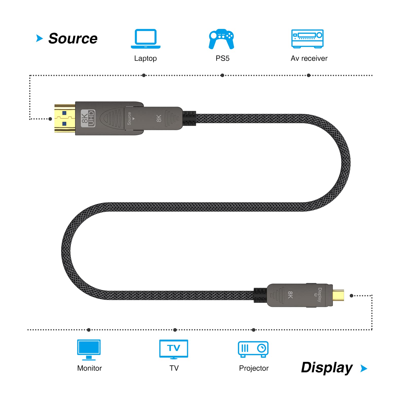- 【One-way transmission】This 8k optical HDMI 2.1 cable is one-way transmission “SOURCE” plug for connecting HDMI source(Blu-ray, STBox etc.) DISPLAY plug for connecting your HDMI display device(TV, cinema projector, etc.) Backwards compatible with HDMI 2.0, 1.4 & 1.3.