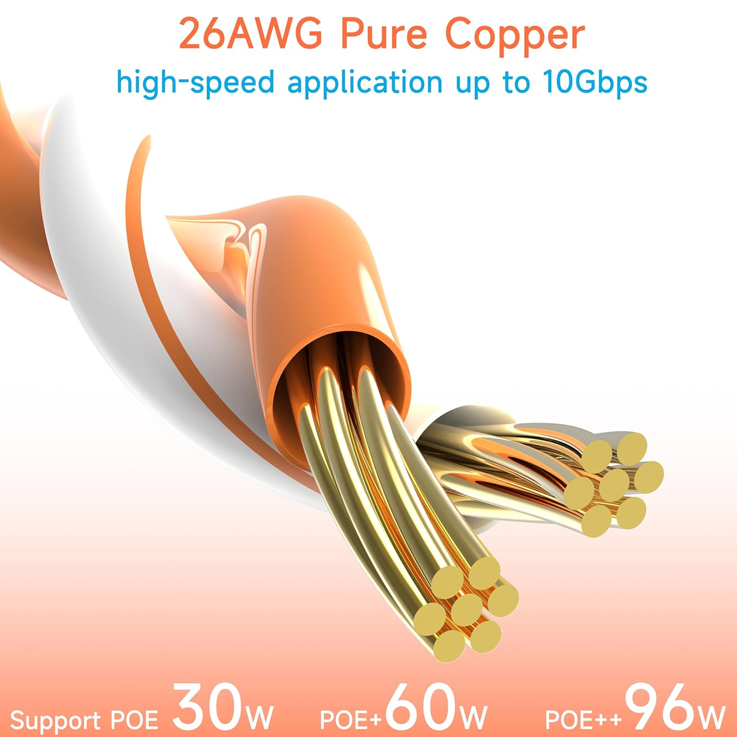 26AWG copper Ethernet cables are rated for both PoE / 30 watt and PoE+ / 60 watt applications.