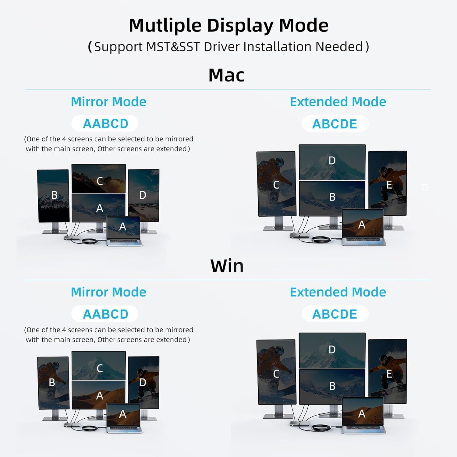 - 【USB A/C to 4xHDMI Adapter】USB 3.0 to Multiple HDMI Adapter allows you to connect screens simultaneously 4K30Hz x2+1080P60Hz x2,supports mirror/extend mode.NOTE:This product requires downloading the driver, and switching to MacBook requires authorized screen recording before restarting to use.ChromeOS, Linux, Unix are not supported.Can’t play HDCP-protected content on sites like Netflix, or Hulu.The USB port and HDMI port must be properly connected for normal operation.