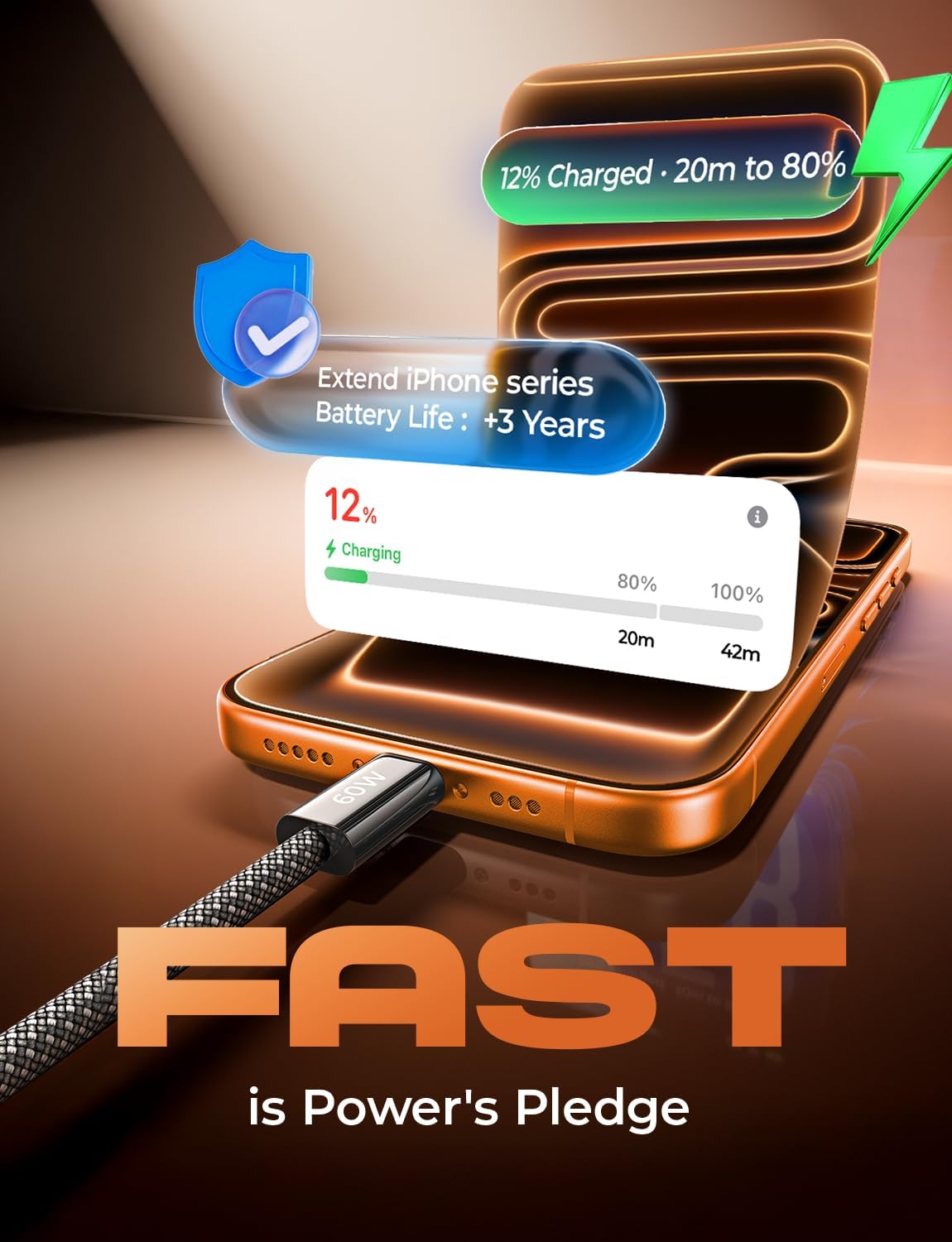- 【60W Turbo Fast Charging】This iPhone 17 charger cord support PD3.0/QC3.0/QC4.0 fast charging up to 60W Max (20V/3A) with USB-C Power Delivery adapters such as 30W/45W/60W. Which 2.2X faster than 3.1A version and charges USB C Phone from 0% to 80% within 35 minutes, iPad Pro 64% within 35 minutes, Macbook air 50% within 35 minutes, and data transfer speeds up to 480Mbps (1200 songs synced per minute) compatible with Samsung,Tablt,iPad Air Mini Pro,Macbook and More.