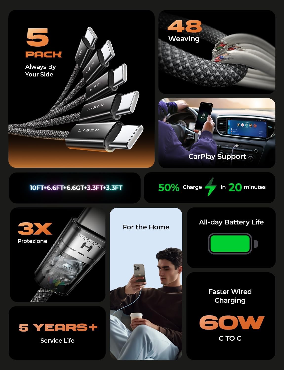 - 【What You Get】LISEN USB C to USB C Cable 5-Pack (3.3/3.3/6.6/6.6/10FT), 18-Month worry-free period and 24/7 customer service, if you have any questions, we will resolve your issue within 24 hours. Whether you’re shopping for samsung or iphone 16 pro max charger cord accessories gifts for men/women or reliable car accessories, this super fast charger usb c to c cable is built to last