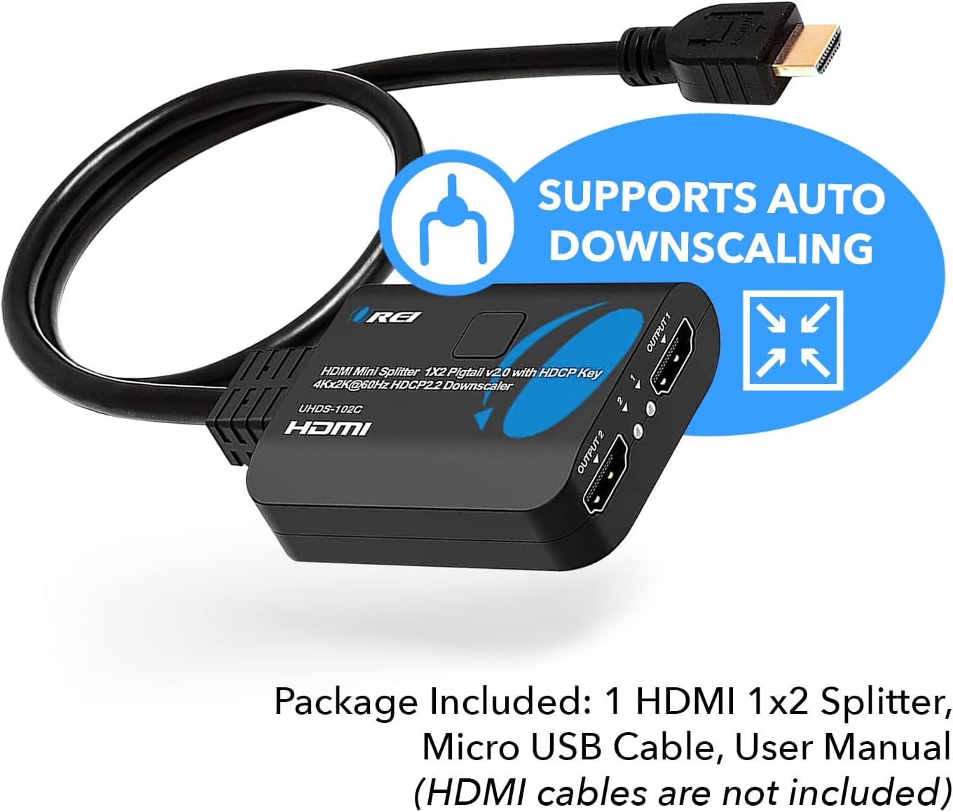 - 1 Year Full Warranty with OREI Support. Includes: UHDS-102 HDMI Splitter 1 in 2 out, Micro USB cable, Manual. We recommend using this splitter with HDMI cables that are 30 feet or shorter and of excellent quality.