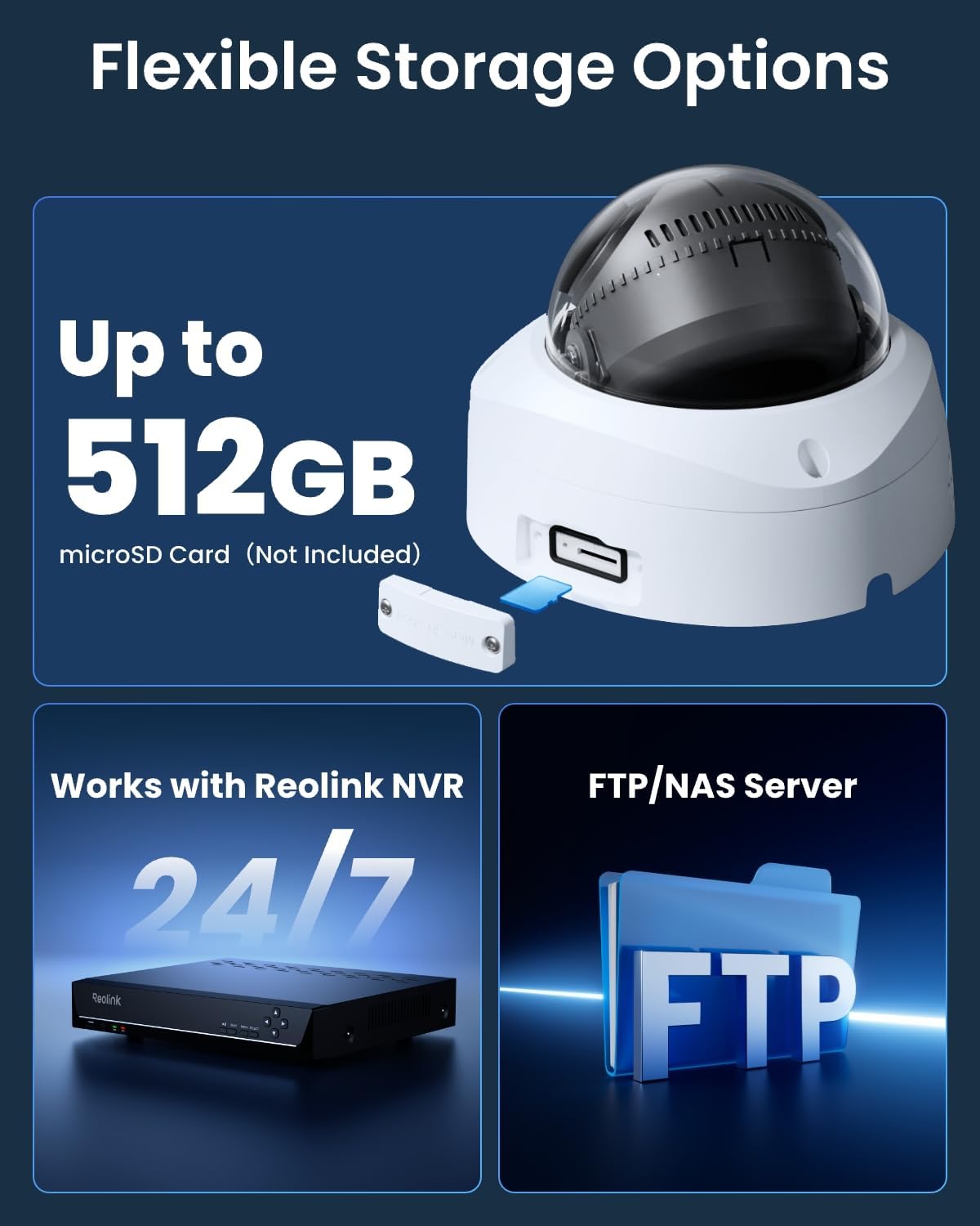 | Storage: | micro SD Card Slot (support up to 512GB micro SD card);Reolink NVR; FTP Smart Detection: Motion detection AI detection(Person/Vehicle/Animal) |