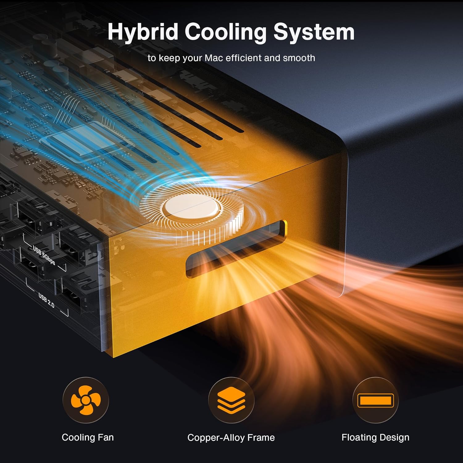 - 【Hybrid Cooling System】This docking station features a multi-layer heat dissipation design, with an internal copper plate for efficient heat dissipation, an elevated structure to promote airflow, and a built-in fan for continuous cooling. These elements work together to ensure stable performance for your devices during extended use