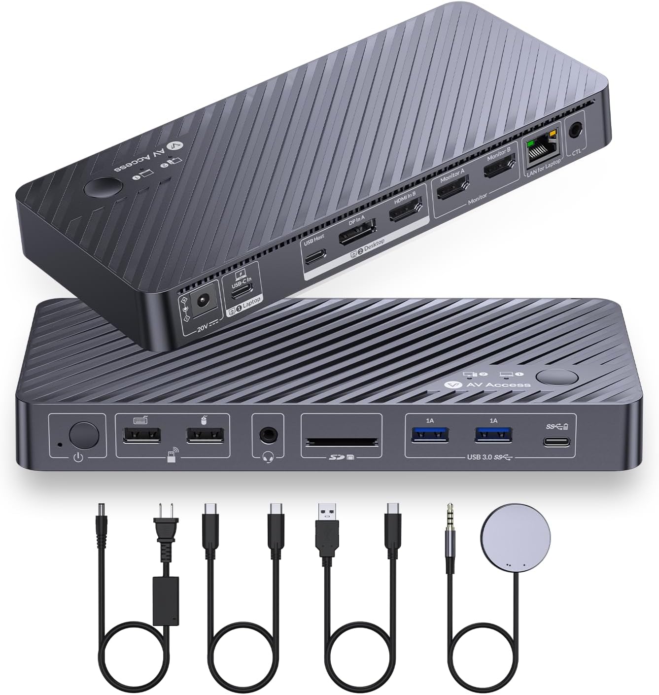 AV Access Docking Station Dual Monitor for Laptop & Desktop, KVM Switch 2 Monitors 2 Computers with Ethernet, EDID, 4K@60Hz Dual Display, 4xUSB-A, 1xUSB-C, Power Supply for Laptop, Audio, SD
