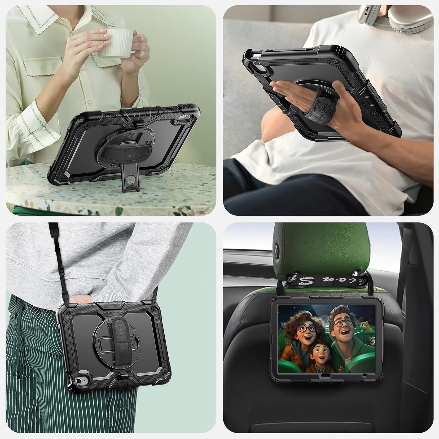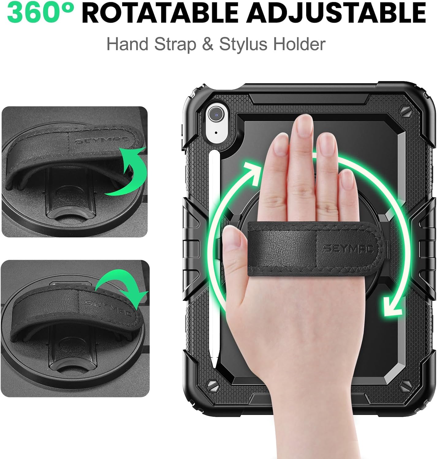 SEYMAC Case for iPad (A16) 11th/10th Generation 2025/2022 (11″/10.9″), Sturdy Heavy Duty Full-Body Shockproof Protective Case with Screen Protector, Rotating Stand, Hand/Shoulder Strap, Black