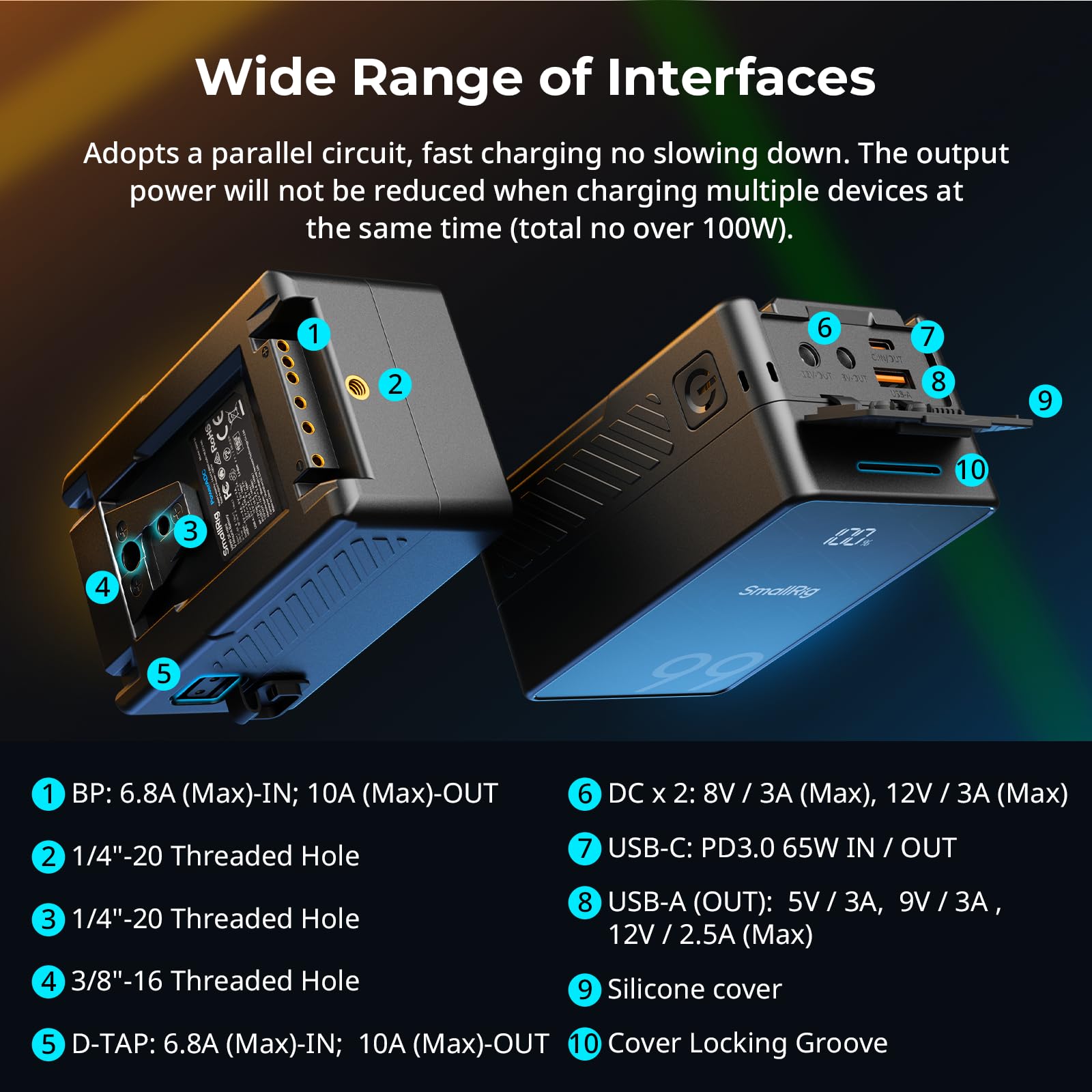 - Real-Time Power Monitoring: The SmallRig V Mount Battery comes equipped with a bright OLED screen, offering instant visibility into port status, voltage, power output, and remaining battery life—eliminating any guesswork. Effortless Control, Single Click: Wake the screen for real-time updates. Double Click: Toggle between voltage and power displays. Long Press (3 Seconds): Disable USB-C, USB-A, and DC ports to halt discharging. With intuitive controls and precise monitoring, the SmallRig V-Mount Battery ensures you’re always in charge of your power supply.