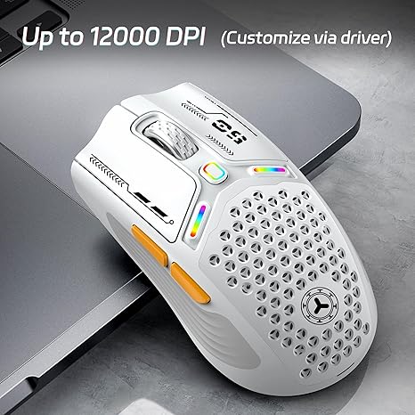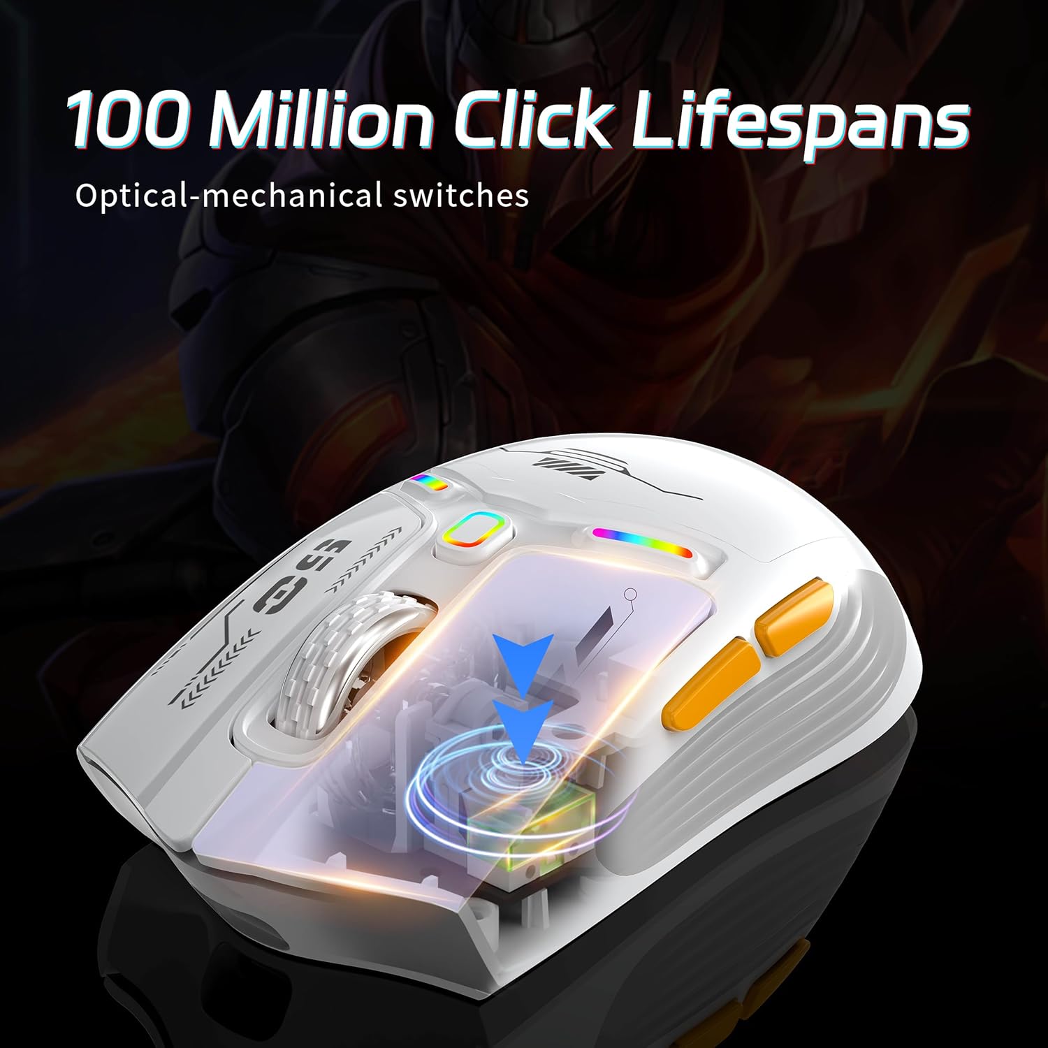 TENMOS M530 Wireless Gaming Mouse, 2.4G/Bluetooth/USB C Wired Rechargeable Mouse, 12000 DPI, RGB, 6 Programmable Buttons, Honeycomb Magnetic Cover, with Receiver Extender for Laptop/PC/Mac, White