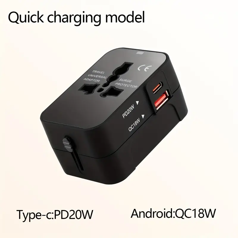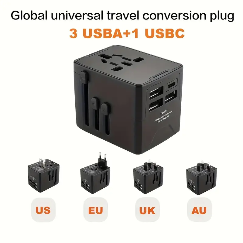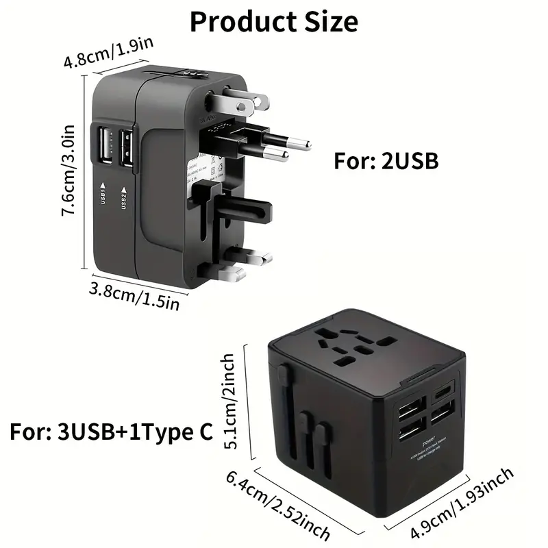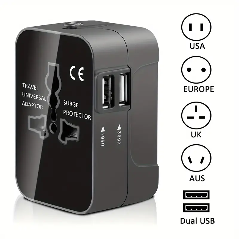 Universal travel plug adapter with 2 USB ports, compact design, worldwide compatibility, fast charging, and built-in safety features.