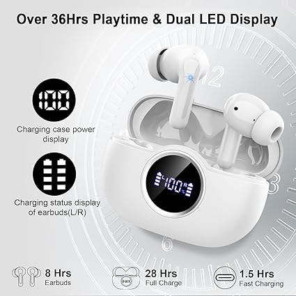 • 【40Hrs Playtime, Real-time LED Power Display】The ear buds wireless can last 6-8 hours playtime from a single charge and provides extra 36 hours playtime with charging case. Dual LED battery display design, You can precisely control the power status of the charging box(0-100%)and each wireless ear bud when in charging. Equipped with USB-C cable offers you more quick and stable charging. Ensure that you always know the remaining battery level and enjoy uninterrupted music experience during long journeys or busy workdays.