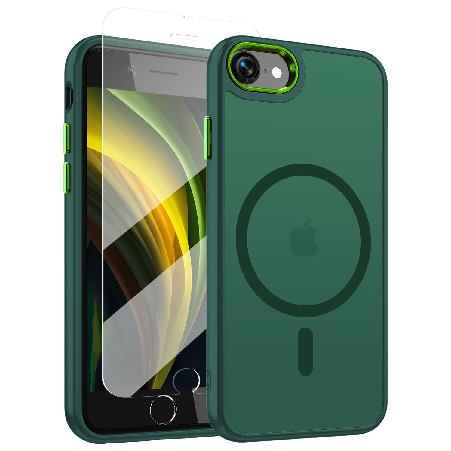 WRJ Case for iPhone SE 2022/2020/7/8 with Screen Protector,Translucent Phone Case for Women Men [Compatible with Magsafe] Slim Anti-Fingerprints Shockproof Protective Cover-Dark Green