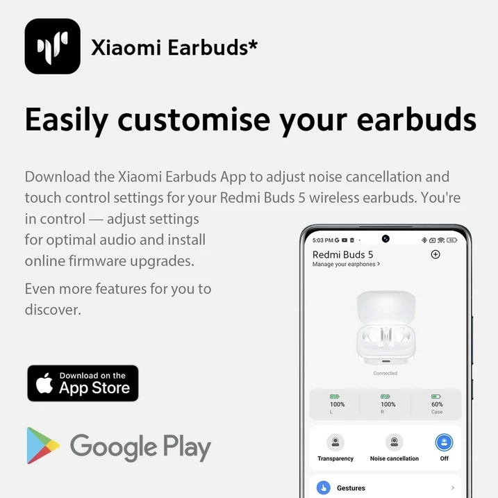 Download the Xiaomi Earbuds App to adjust noise cancellation and touch control settings for your Redmi Buds 5 wireless earbuds. You’re in control — adjust settings for optimal audio and install online firmware upgrades.