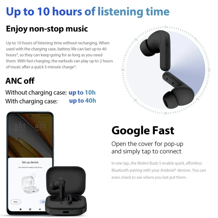 In one tap, the Redmi Buds 5 enable quick, effortless Bluetooth pairing with your Android* devices. You can even check to see where you last put them.